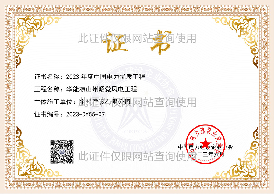 國優(yōu)證書:華能涼山州昭覺風(fēng)電工程