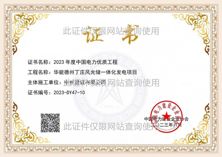 國優(yōu)證書:華能德州丁莊水庫200MW光伏發(fā)電項(xiàng)目主體施工單位